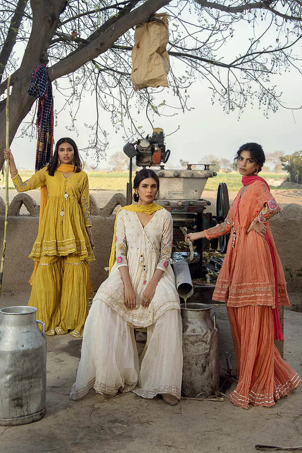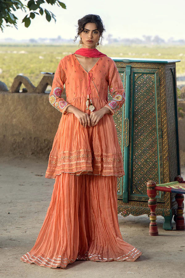 Khudabaksh Anghrakha Frock. Crafted from premium Paper Cotton, the frock features exquisite 3D embroidery, gotta, and shimmering sequins for a touch of glamour. The attached sleeves match the shirt, ensuring a seamless look. Paired with a flowy Sharara in the same fabric and a delicate Crinkle Chiffon Dupatta, this ensemble is perfect for festive occasions.