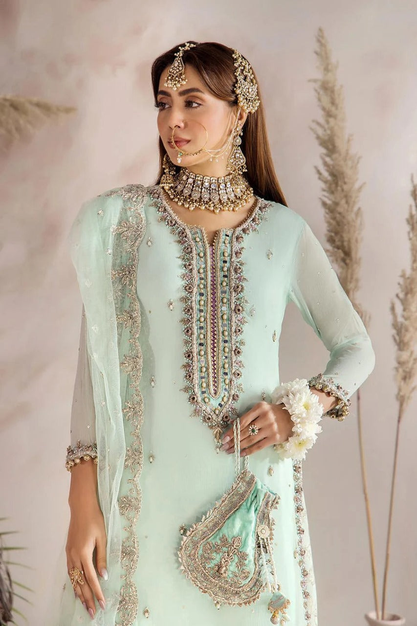 - Shirt: Crinkle Chiffon (Hand Embroidered with Kora, Dabka, Stones and Gotta)