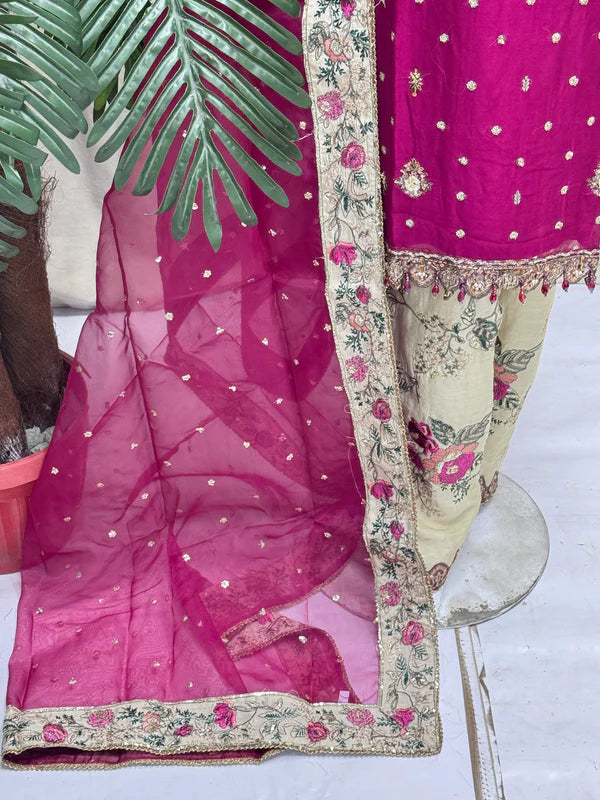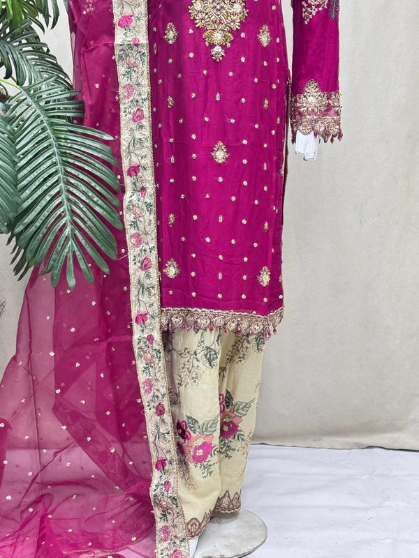 Fabric: Chiffon shirt fully embroiderd paired with embroiderd jamawar style shalwar and organza embroiderd dupatta..