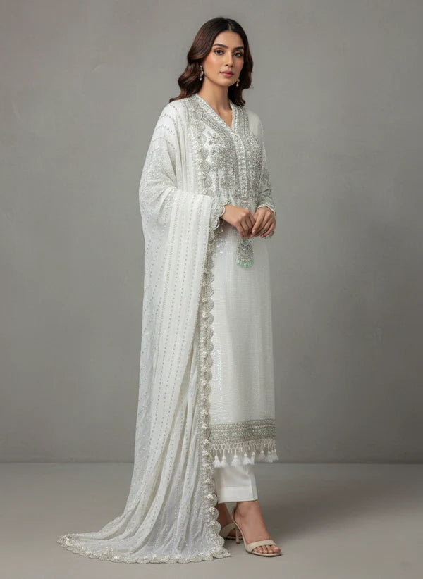 Fabric chiffon baggy shirt heavy work on neck and daman and full sequence on shirt paired with sleek grip trousers and chiffon embroiderd dupatta