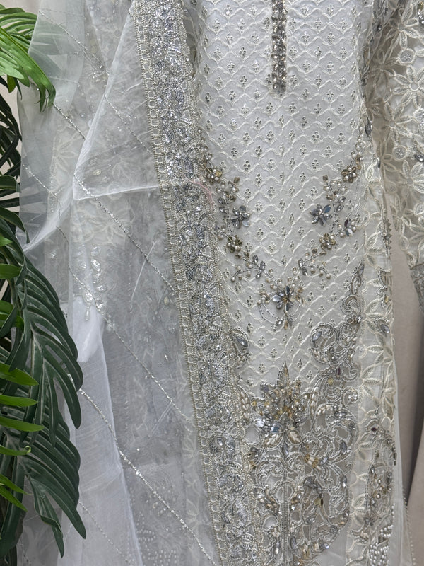 Organza shirt beautifully embroiderd with thread,sequence and stone work and embalished neckline paired with organza dupatta and grip flowy plazo...