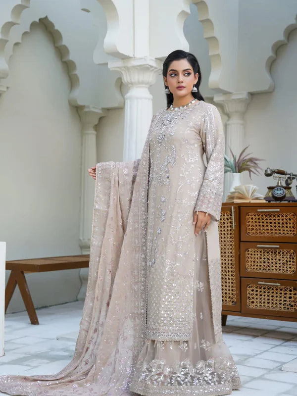 Fabric: Chiffon long shirt fully embroiderd paired with embroiderd net sharara and chiffon embroiderd dupatta..
